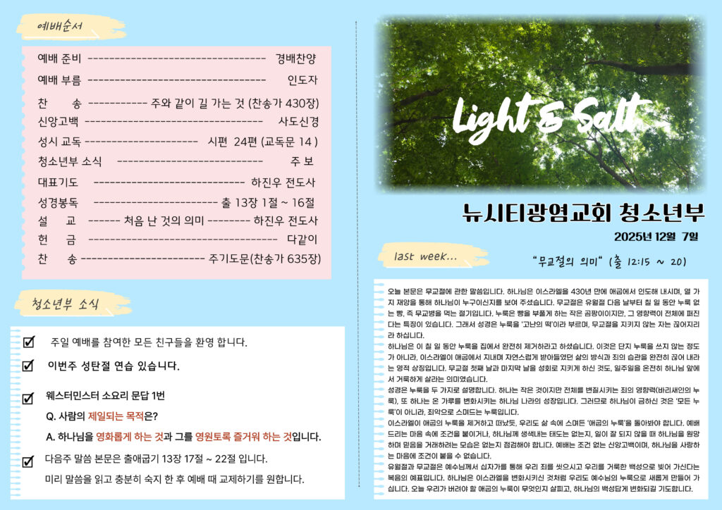 “무교절에 누룩을 제하라” _(출12:15-20)_25.11.30_ 출애굽기 강해 22