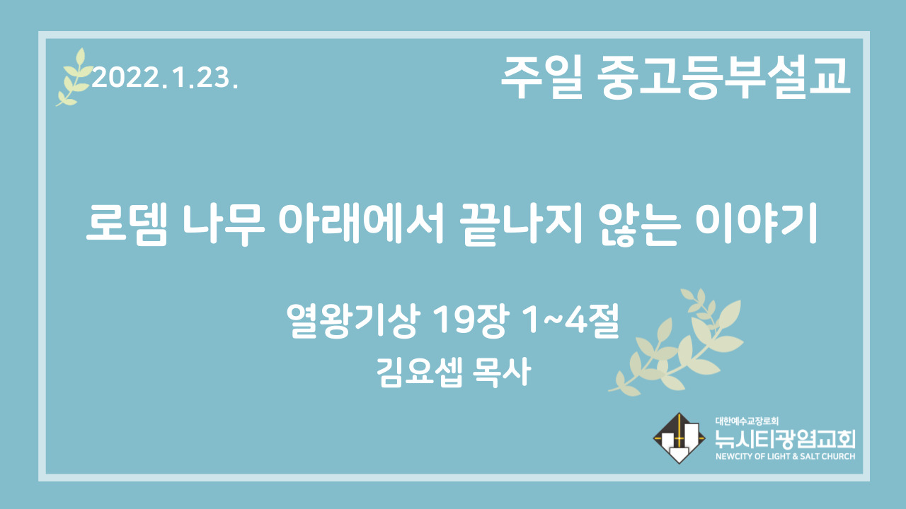 22.1.23. 중고등부 설교 “로뎀 나무 아래에서 끝나지 않는 이야기”(왕상 19:1~4)