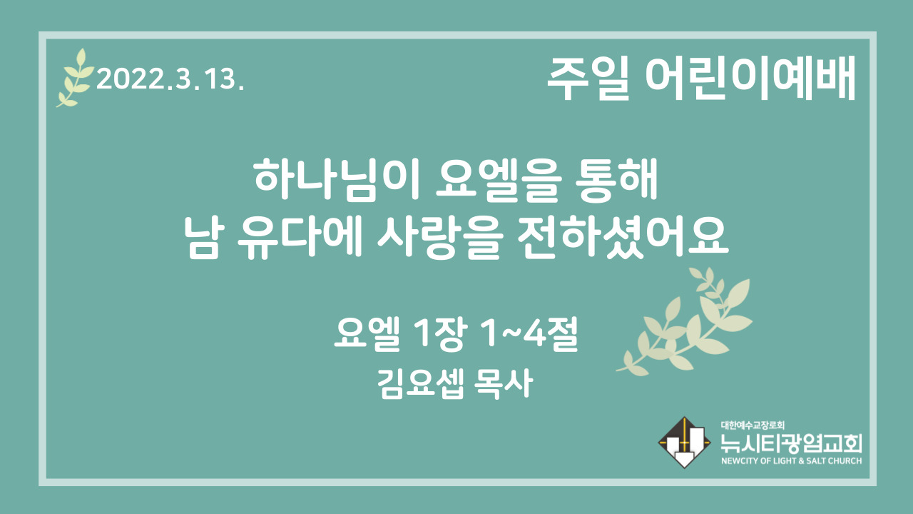 22.3.13. 어린이 영상 예배 “하나님이 요엘을 통해 남 유다에 사랑을 전하셨어요”(욜 1:1~4)