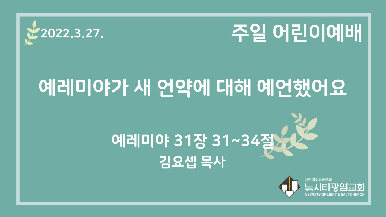 22.3.27. 어린이 영상 예배 “예레미야가 새 언약에 대해 예언했어요”(렘 31:31~34)