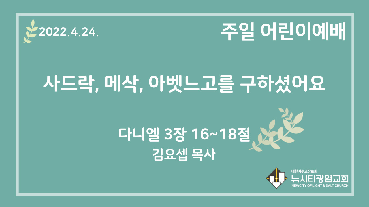22.4.24. 어린이 영상 예배 “사드락, 메삭, 아벳느고를 구하셨어요”(단 3:16~18)
