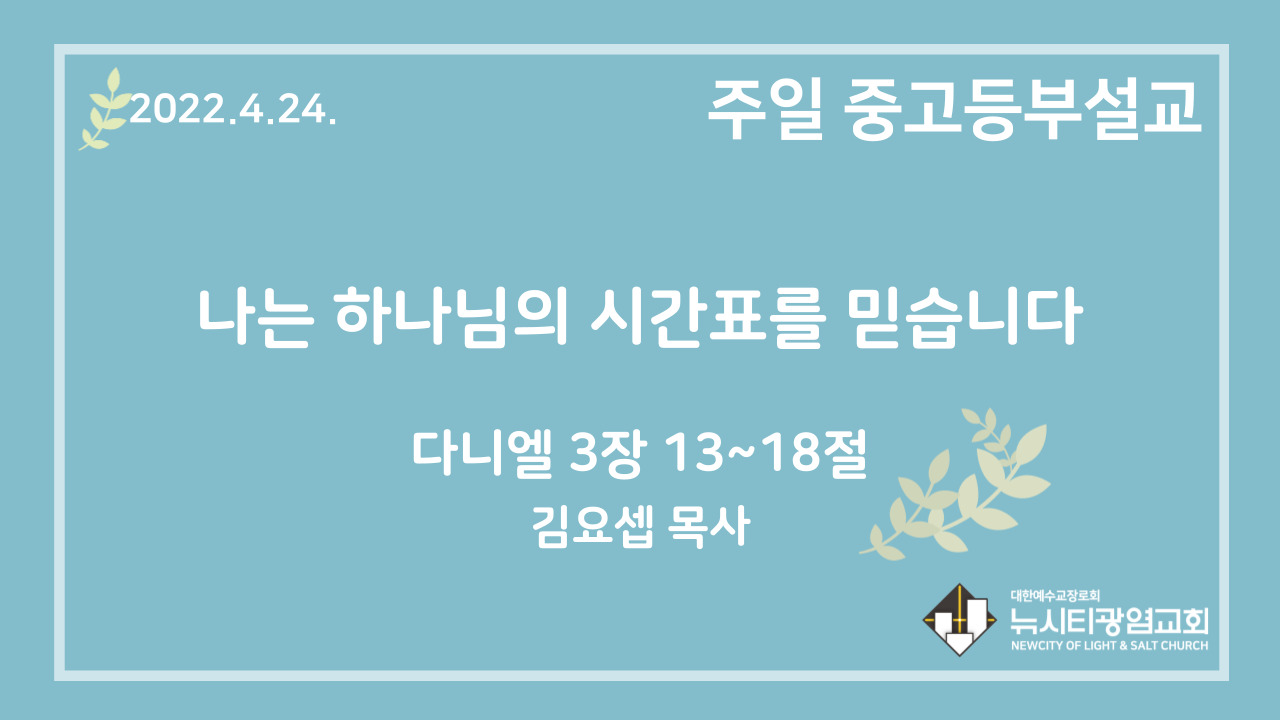22.4.24. 중고등부 설교 “나는 하나님의 시간표를 믿습니다”(단 3:13~18)