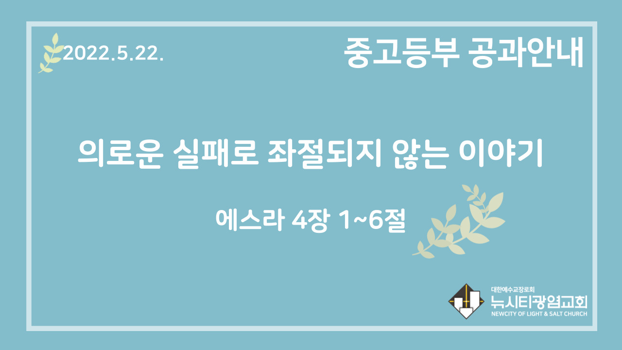 오늘 말씀은 에스라 4~6장, 성전 재건 중단과 성전 재건 완성 이야기입니다.