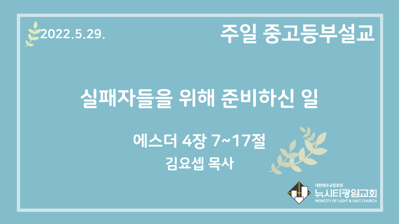 22.5.29. 중고등부 설교 “실패자들을 위해 준비하신 일”(에 4:7~17)