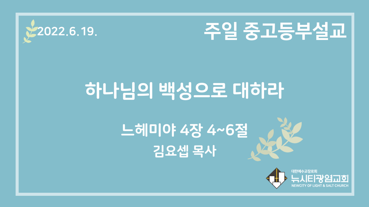 22.6.19. 중고등부 설교 “하나님의 백성으로 대하라”(느 4:4~6)