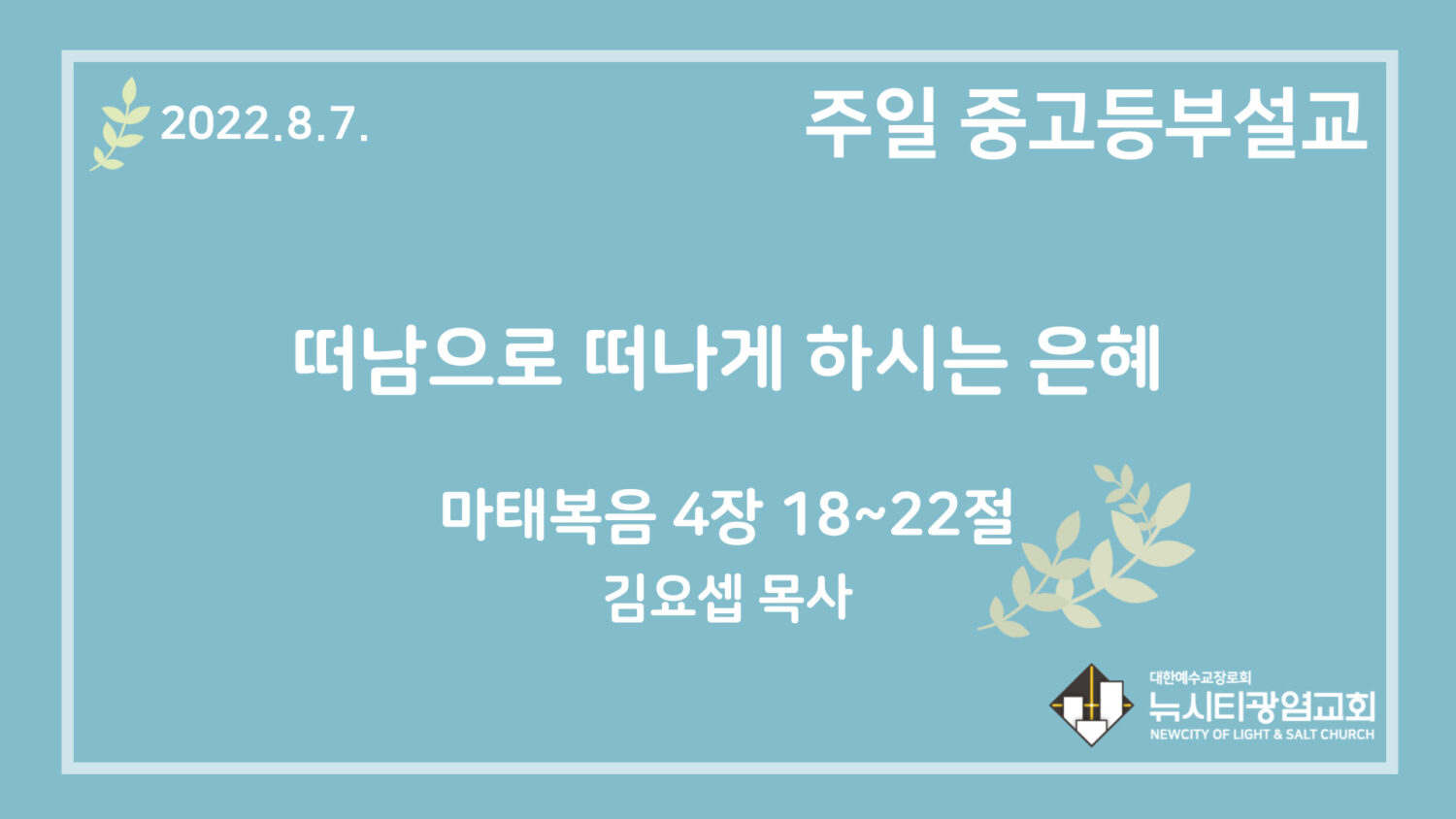 22.8.7. 중고등부 설교 “떠남으로 떠나게 하시는 은혜”(마 4:18~22)