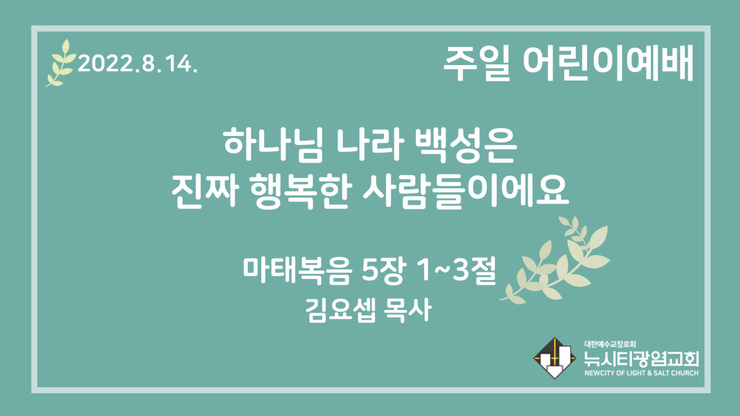 22.8.14. 어린이 영상 예배 “하나님 나라 백성은 진짜 행복한 사람들이에요”(마 5:1~3)