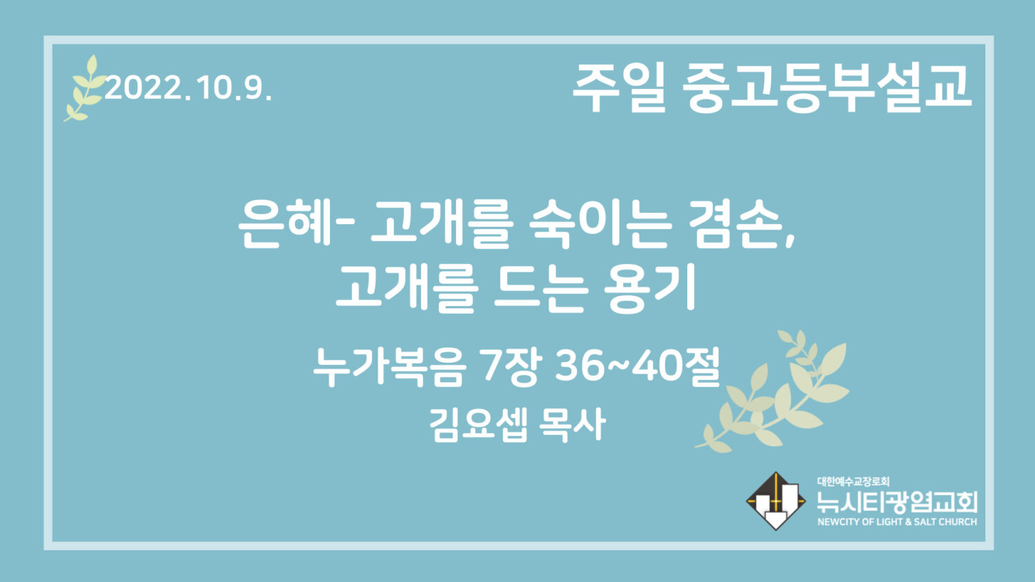 22.10.9. 중고등부 설교 “은혜- 고개를 숙이는 겸손, 고개를 드는 용기”(눅 7:36~50)