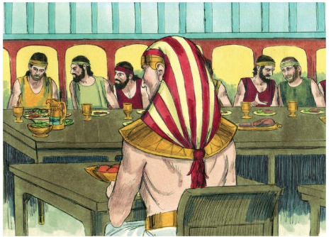 요셉은 자신의 식탁에 있는 음식을 형들에게 건네주며 형들과 겸상합니다.