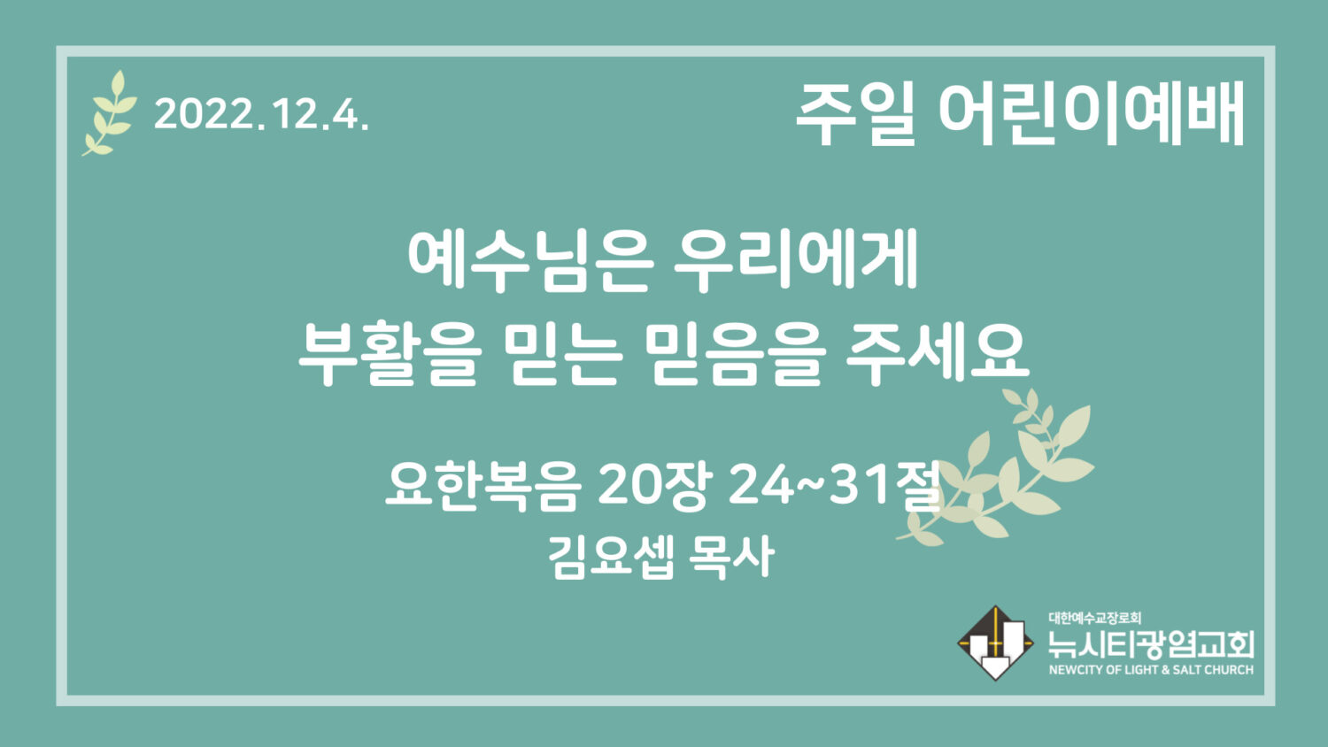 22.12.4. 어린이 영상 예배 “예수님은 우리에게 부활을 믿는 믿음을 주세요”(요 20:24~31)