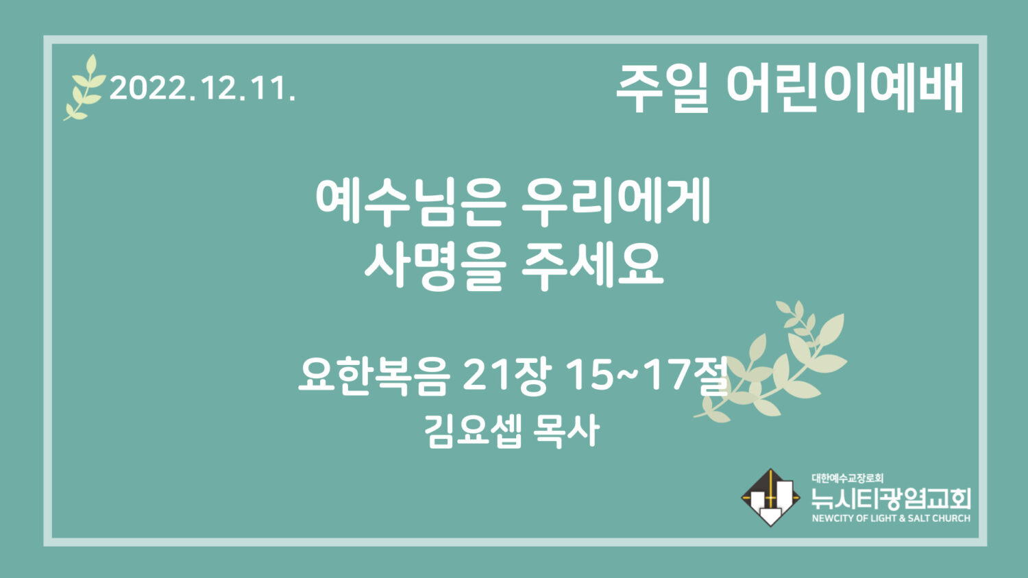 22.12.11. 어린이 영상 예배 “예수님은 우리에게 사명을 주세요”(요 21:15~17)
