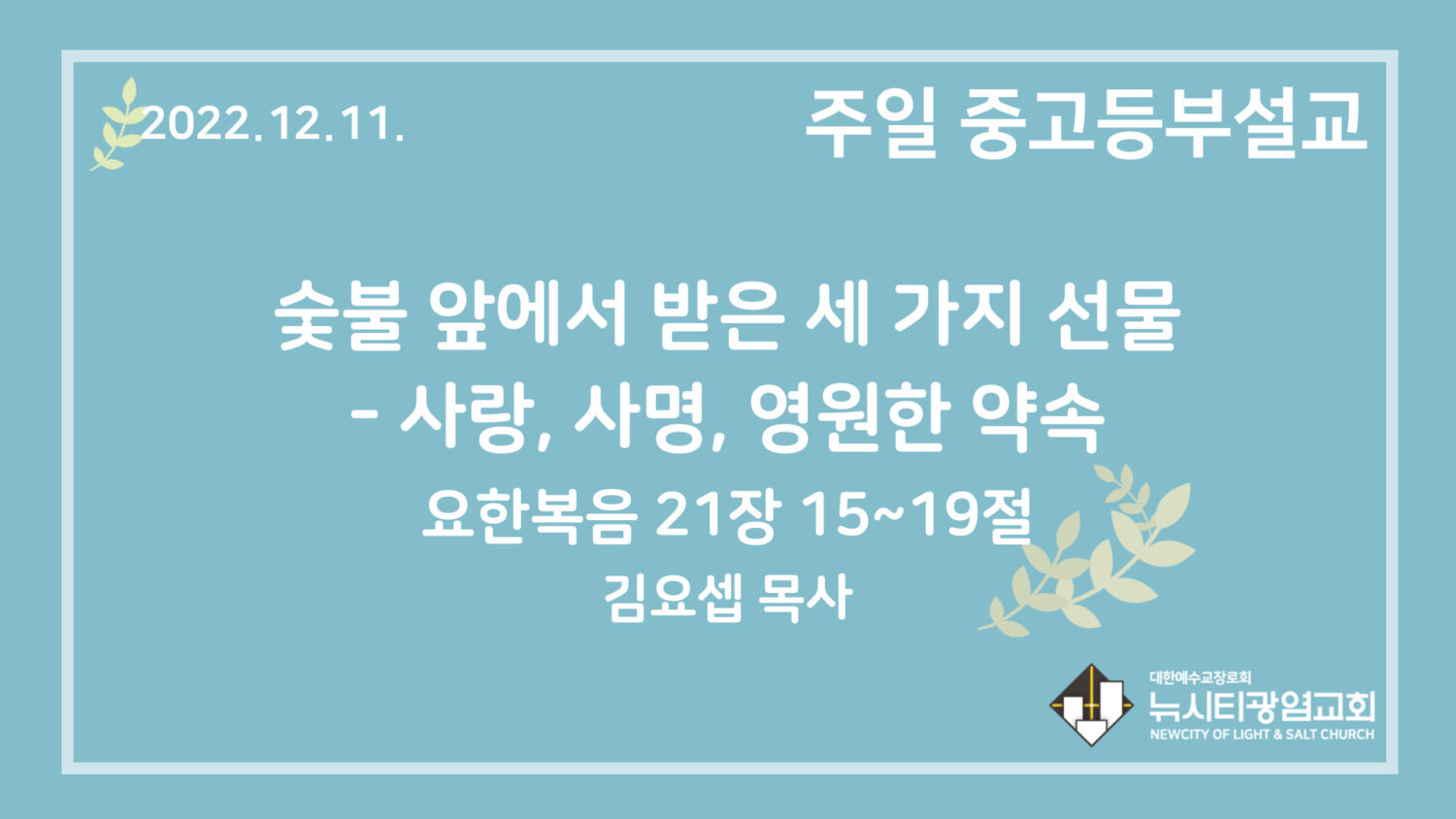 22.12.11. 중고등부 설교 “숯불 앞에서 받은 세 가지 선물- 사랑, 사명, 영원한 약속”(요 21:15~19)