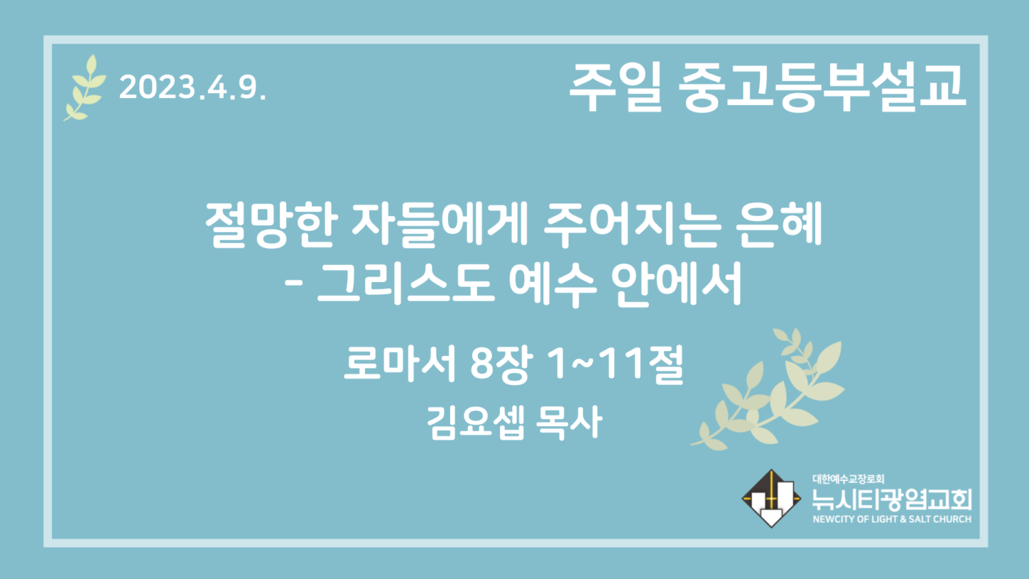 23.4.9. 중고등부 설교 “절망한 자들에게 주어지는 은혜- 그리스도 예수 안에서”(롬 8:1~11)