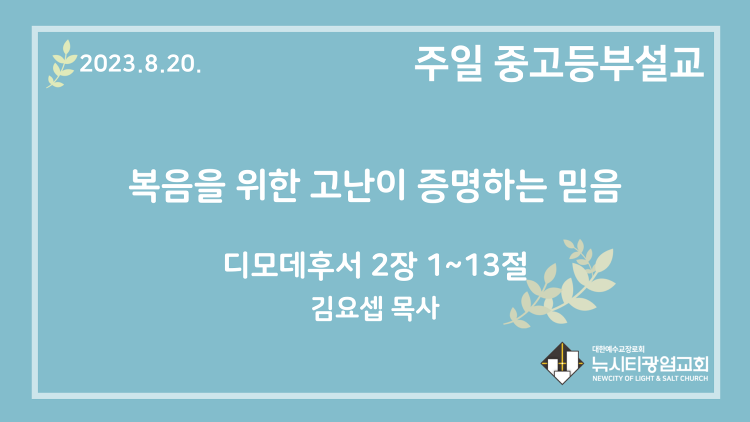 23.8.20. 중고등부 설교 “복음을 위한 고난이 증명하는 믿음”(딤후 2:1~13)