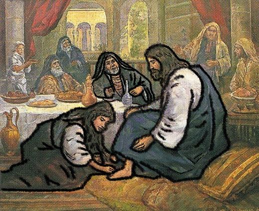 한 여자가 예수님의 발치에 다가와 눈물을 흘리기 시작했습니다.