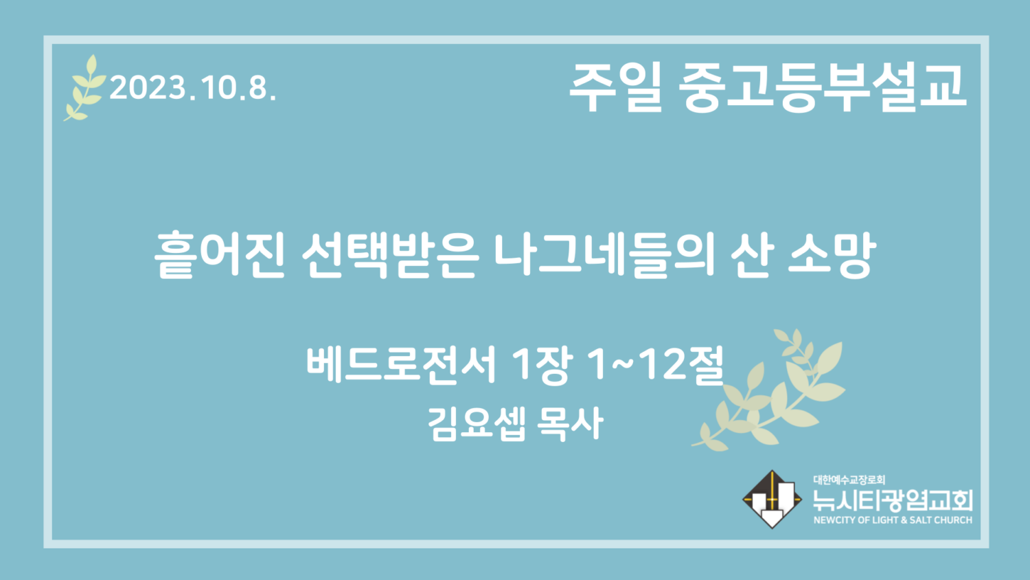 23.10.8. 중고등부 설교 “흩어진 선택받은 나그네들의 산 소망”(벧전 1:1~12)