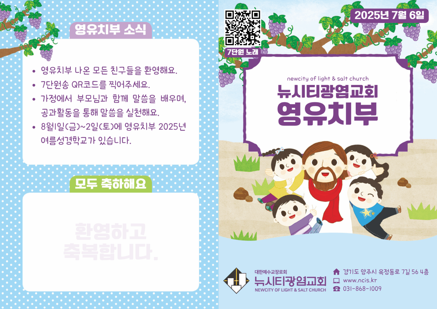 미리보는 7월6일 영유치부 주보 김 정현 7개월 ago "하나님은 예수님을 통해 하나님 나라를 다스리세요."마태복음 1장 23절 - "보라! 처녀가 임신하여 아들을 낳을 것이며, 사람들이 그의 이름을 임마누엘이라고 부를 것이다." 임마누엘은 '우리와 함께 계시는 하나님' 이라는 뜻입니다.