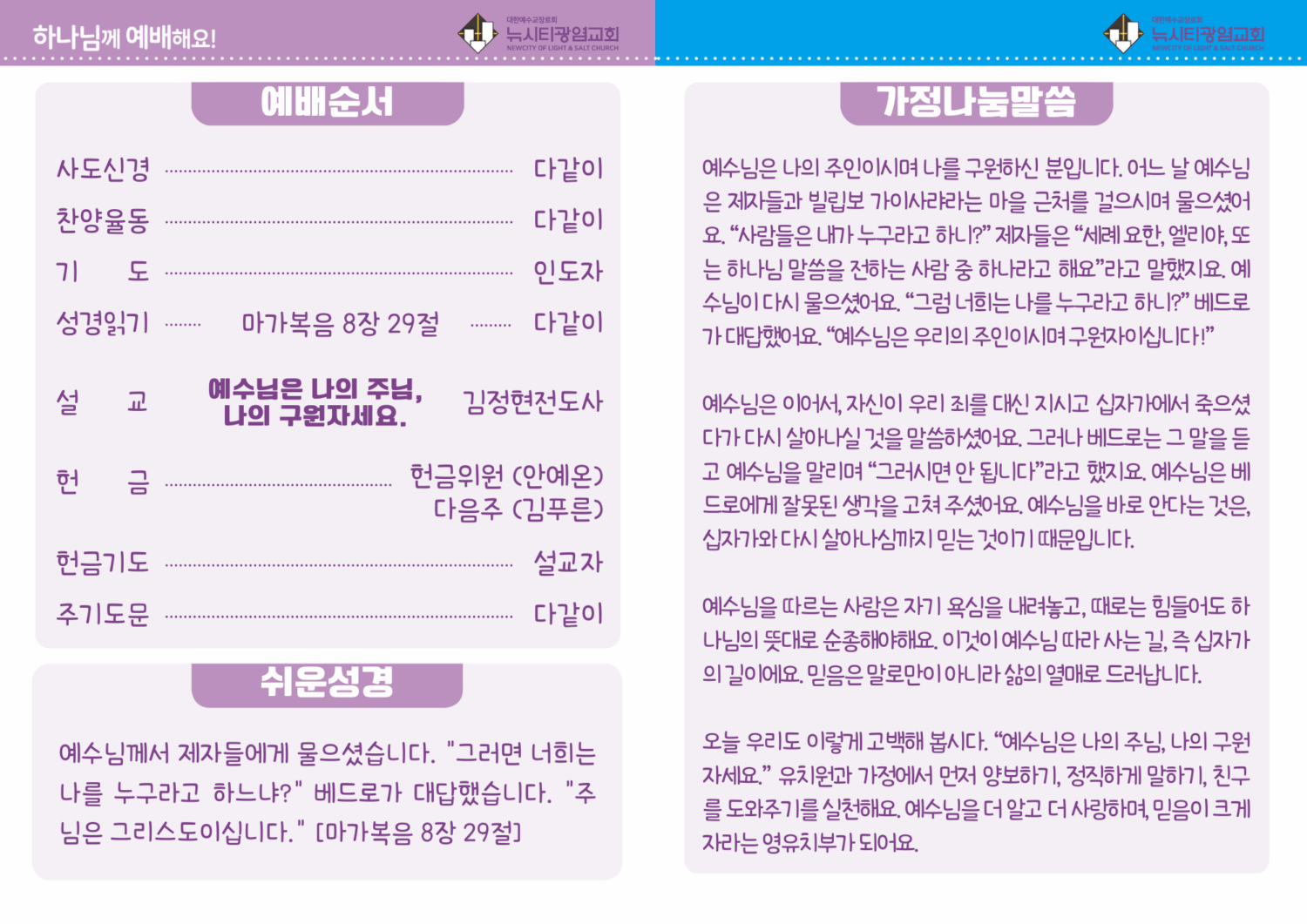 미리보는 9월 21일 영유치부 주보 By 김 정현 - 2025년 9월 20일 61 “예수님은 나의 주님, 나의 구원자세요.마가복음 8장 29절 – 예수님께서 제자들에게 물으셨습니다. “그러면 너희는 나를 누구라고 하느냐?” 베드로가 대답했습니다. “주님은 그리스도이십니다.” RELATED ARTICLESMORE FROM AUTHOR 미리보는 10월 12일 영유치부 주보 미리보는 10월 5일 영유치부 주보 미리보는 9월 28일 영유치부 주보 미리보는 9월 14일 영유치부 주보 미리보는 9월 7일 영유치부 주보