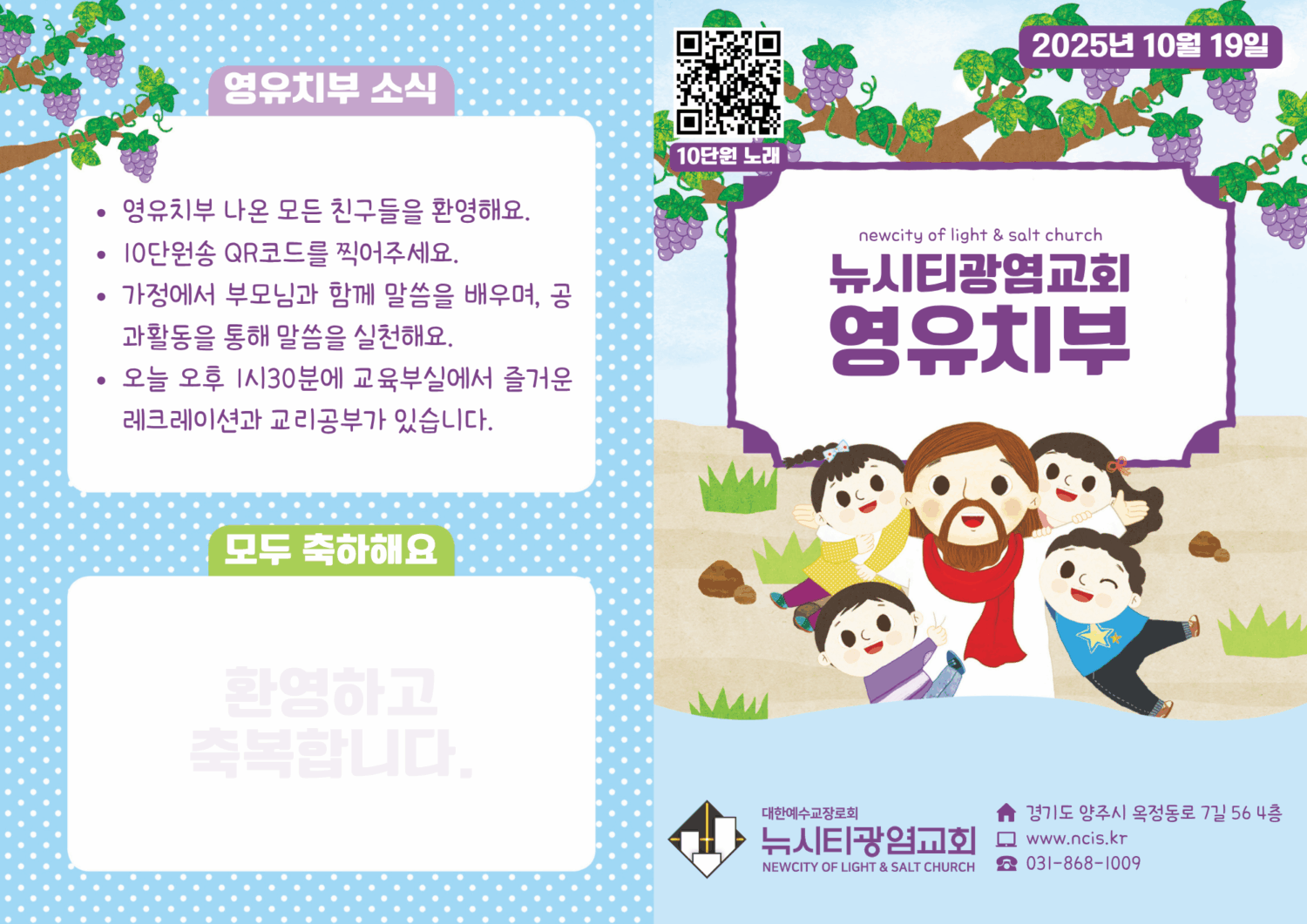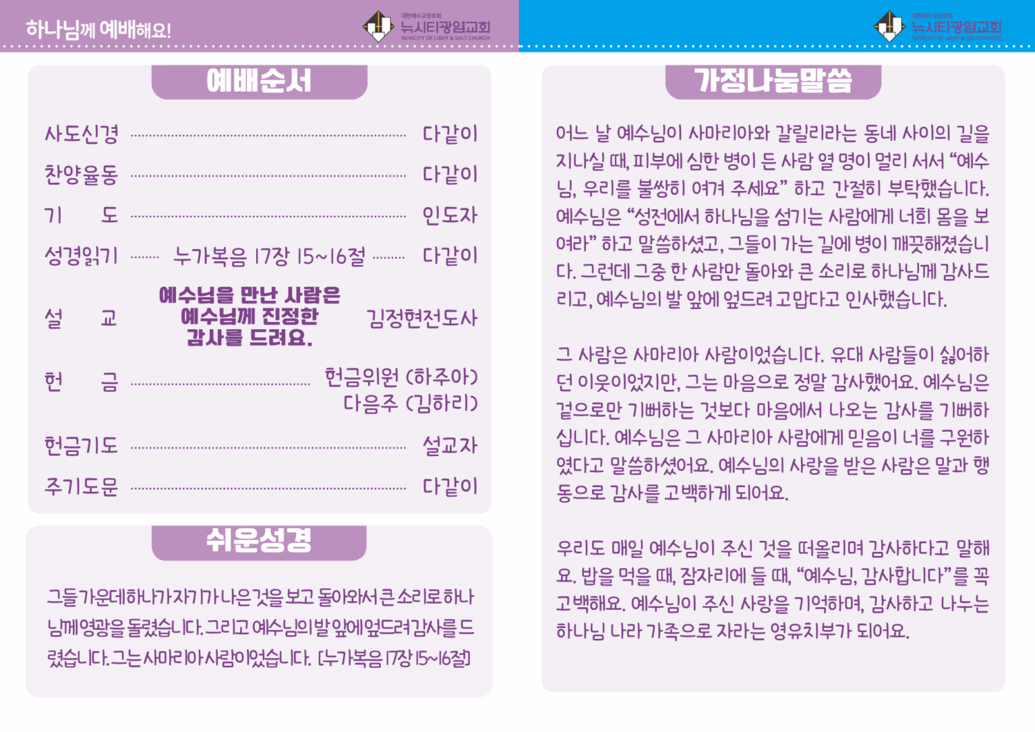 미리보는 10월 19일 영유치부 주보 By 김 정현 - 2025년 10월 18일 8 “예수님을 만난 사람은 예수님께 진정한 감사를 드려요”누가복음 17장 15~16절 – 그들 가운데 하나가 자기가 나은 것을 보고 돌아와서 큰 소리로 하나님께 영광을 돌렸습니다. 그리고 예수님의 발 앞에 엎드려 감사를 드렸습니다. 그는 사마리아 사람이었습니다. RELATED ARTICLESMORE FROM AUTHOR 미리보는 10월 12일 영유치부 주보 미리보는 10월 5일 영유치부 주보 미리보는 9월 28일 영유치부 주보 미리보는 9월 21일 영유치부 주보 미리보는 9월 14일 영유치부 주보