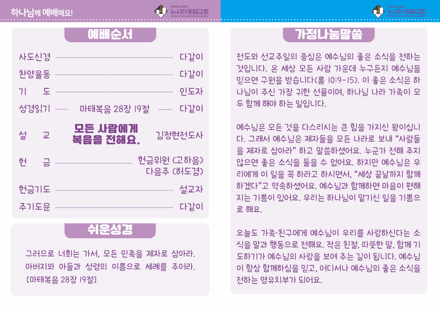 미리보는 11월 2일 영유치부 주보 By 김 정현 - 2025년 11월 1일 10 “모든 사람에게 복음을 전해요”마태복음 28장 19절 – 그러므로 너희는 가서, 모든 민족을 제자로 삼아라. 아버지와 아들과 성령의 이름으로 세례를 주어라. RELATED ARTICLESMORE FROM AUTHOR 미리보는 10월 26일 영유치부 주보 미리보는 10월 19일 영유치부 주보 미리보는 10월 12일 영유치부 주보 미리보는 10월 5일 영유치부 주보 미리보는 9월 28일 영유치부 주보