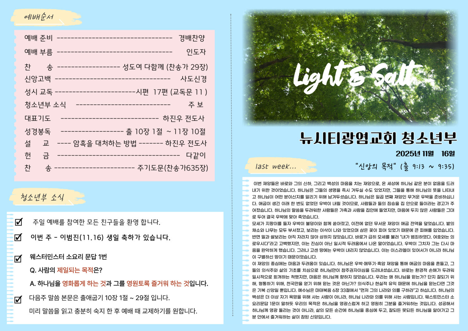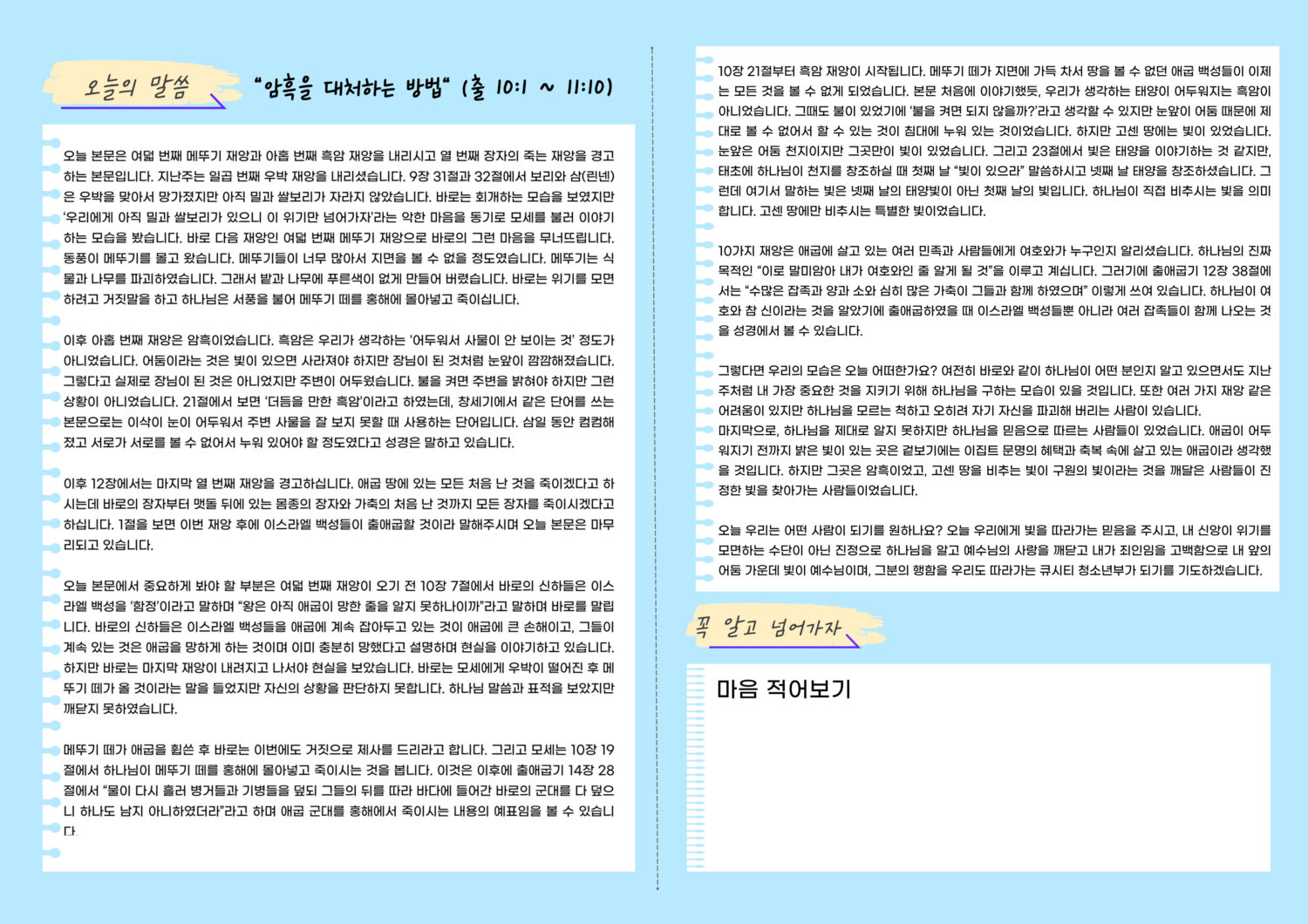 미리보는 11월 16일 청소년부 주보 By 하 진우 - 2025년 11월 16일 3 암흑을 대처하는 방법 – 출애굽기 10장 1절 ~ 11장 10절 RELATED ARTICLESMORE FROM AUTHOR 미리보는 11월 9일 청소년부 주보 미리보는 11월 2일 청소년부 주보 미리보는 10월 26일 청소년부 주보 미리보는 10월 19일 청소년부 주보 미리보는 10월 12일 청소년부 주보