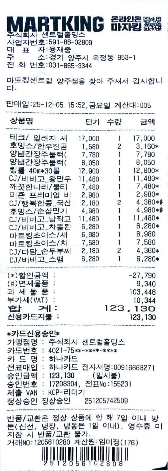 성도님들의 절기 감사 구제 헌금 중 12만 3130원으로 조리가 용이한 냉동식품과 더불어