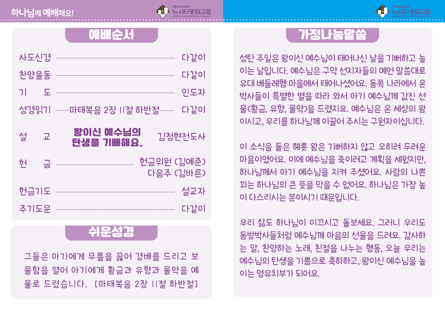미리보는 12월 21일 영유치부 주보 By 김 정현 - 2025년 12월 21일 6 “왕이신 예수님의 탄생을 기뻐해요”마태복음 2장 11절 하반절 – 그들은 아기에게 무릎을 꿇어 경배를 드리고 보물함을 열어 황금과 유향과 몰약을 예물로 드렸습니다. RELATED ARTICLESMORE FROM AUTHOR 미리보는 12월 14일 영유치부 주보 미리보는 12월 7일 영유치부 주보 미리보는 11월 30일 영유치부 주보 미리보는 11월 23일 영유치부 주보 미리보는 11월 16일 영유치부 주보