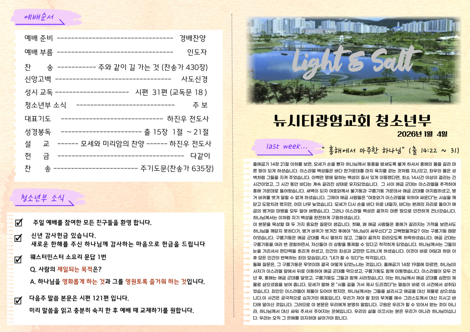 미리보는 1월 4일 청소년부 주보 By 하 진우 - 2026년 1월 4일 18 RELATED ARTICLESMORE FROM AUTHOR 미리보는 12월 28일 청소년부 주보 미리보는 12월 21일 청소년부 주보 미리보는 12월 14일 청소년부 주보 미리보는 12월 7일 청소년부 주보 미리보는 11월 30일 청소년부 주보