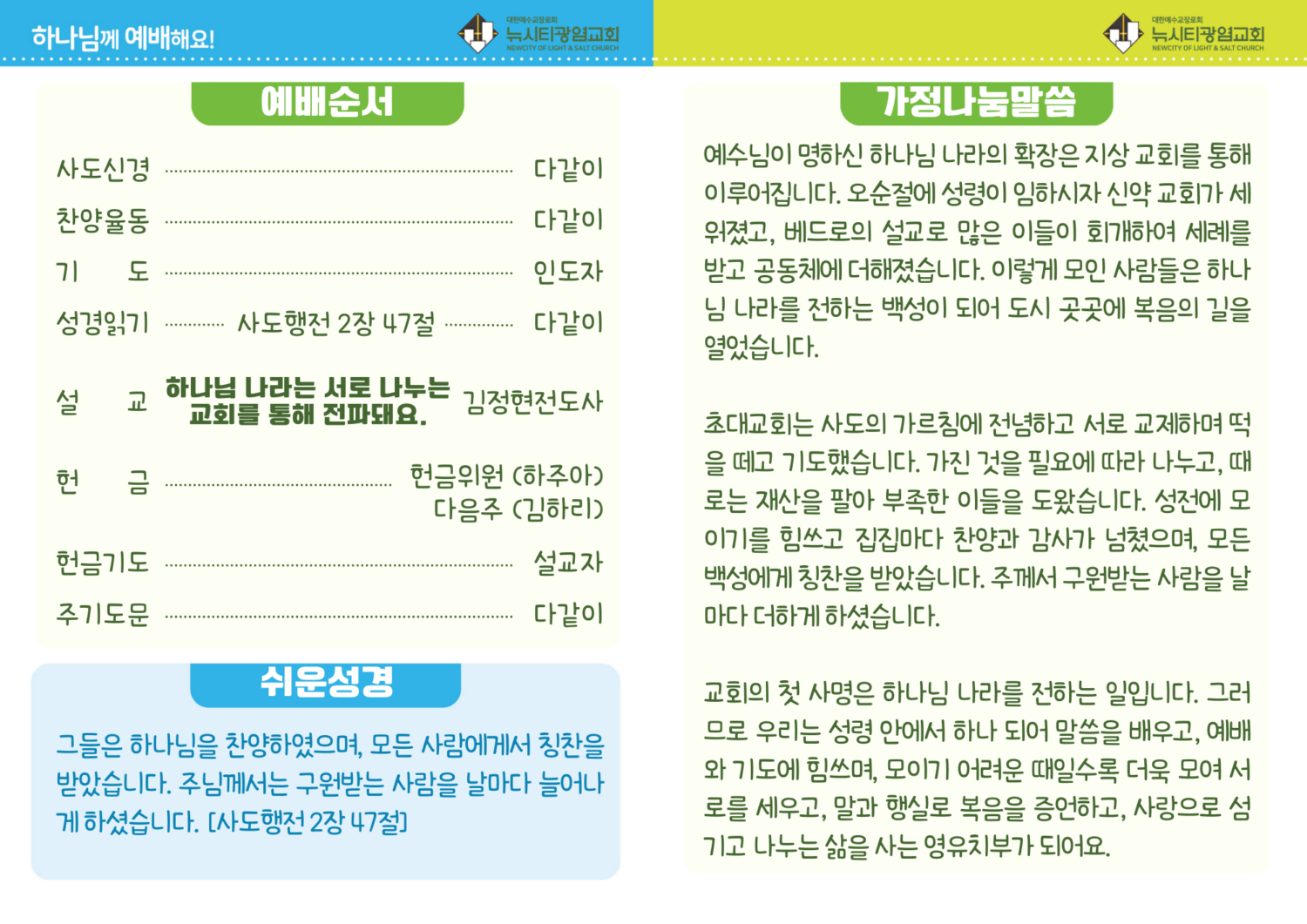 미리보는 1월 11일 영유치부 주보 By 김 정현 - 2026년 1월 10일 20 하나님 나라는 서로 나누는 교회를 통해 전파돼요.사도행전 2장 47절 – 그들은 하나님을 찬양하였으며, 모든 사람에게서 칭찬을 받았습니다. 주님께서는 구원받는 사람을 날마다 늘어나게 하셨습니다. RELATED ARTICLESMORE FROM AUTHOR 미리보는 1월 4일 영유치부 주보 미리보는 12월 28일 영유치부 주보 미리보는 12월 21일 영유치부 주보 미리보는 12월 14일 영유치부 주보 미리보는 12월 7일 영유치부 주보