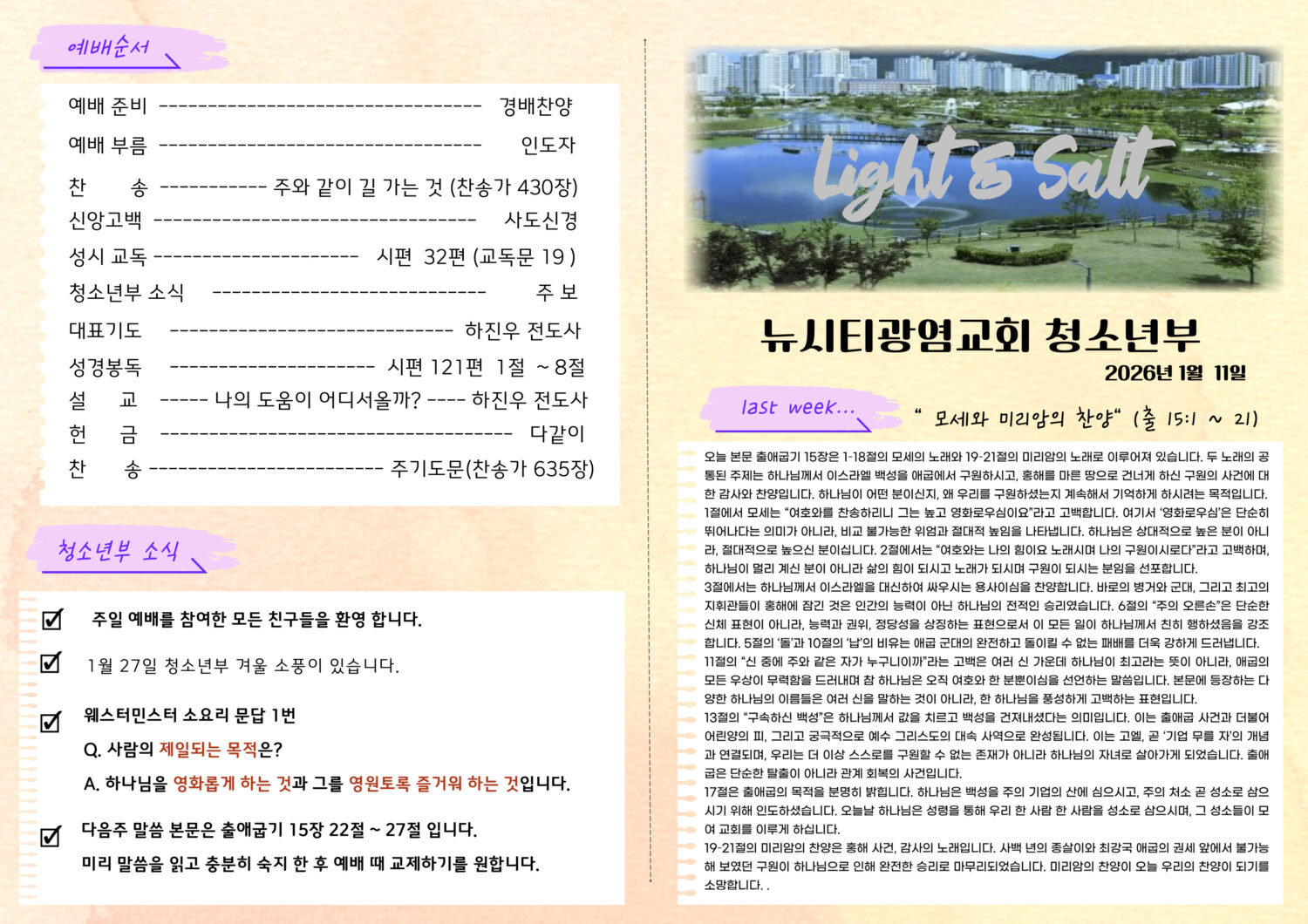 미리보는 1월 11일 청소년부 주보 By 하 진우 - 2026년 1월 11일 49 RELATED ARTICLESMORE FROM AUTHOR 미리보는 1월 4일 청소년부 주보 미리보는 12월 28일 청소년부 주보 미리보는 12월 21일 청소년부 주보 미리보는 12월 14일 청소년부 주보 미리보는 12월 7일 청소년부 주보
