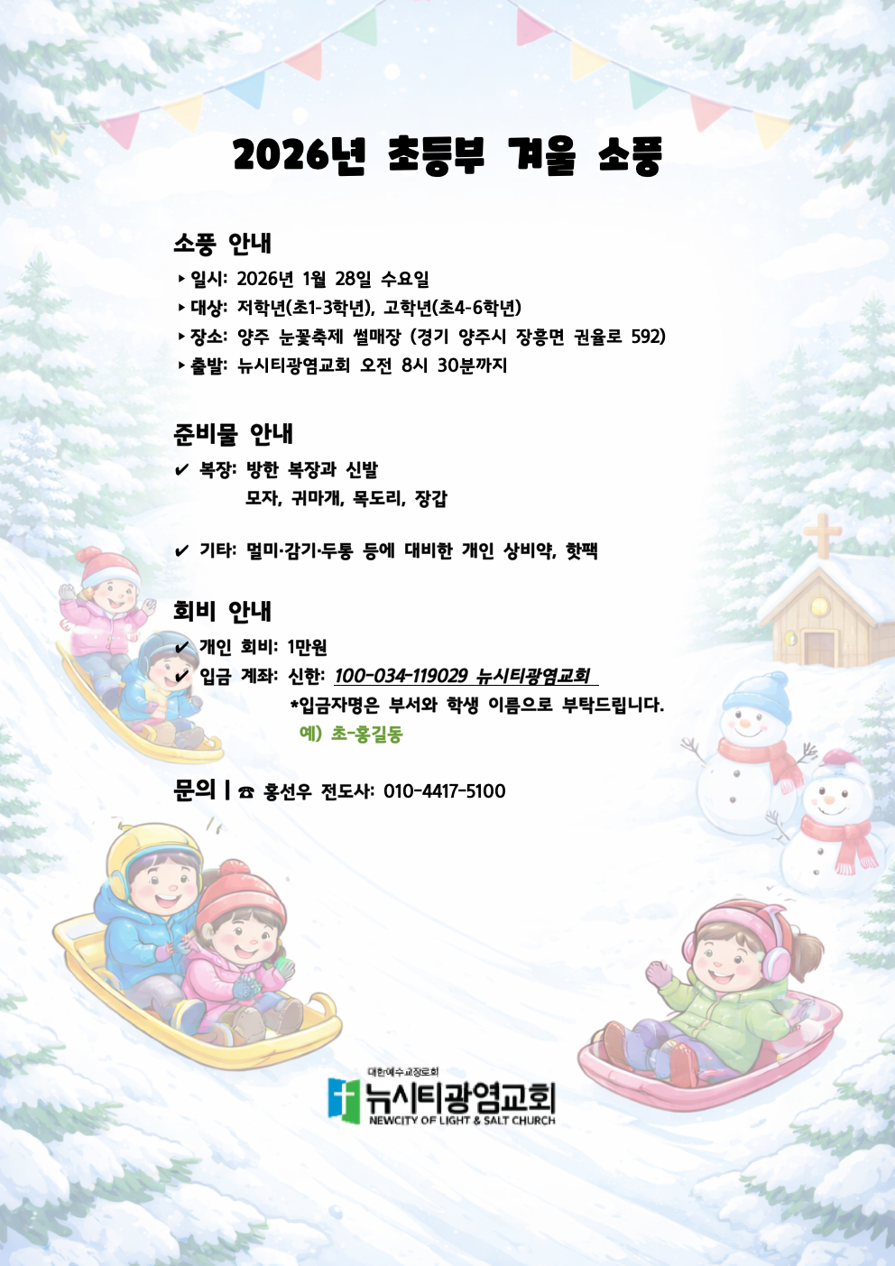 [공지] 2026 소년부 겨울 소풍 안내 By 선우 홍 - 2026년 1월 18일 11 RELATED ARTICLESMORE FROM AUTHOR [구제] 다리 수술 후 홀로서기를 노력 중인 지적장애 청년 이웃을 지원했습니다 [구제] 소아마비로 거동이 불편한 양주 덕정의 독거 어르신을 도왔습니다 [성탄 구제] 8가정, 총 14명의 자녀들에게 새신발을 신겨주었습니다 이동현, 서정인 부부의 결혼 예식이 12월 27일 (토) 오후 2시 30분에 용산 국방컨벤션웨딩홀 에메랄드홀에서 있습니다 [구제] 고관절 장애로 거동이 불편한 홀몸 어르신을 도왔습니다