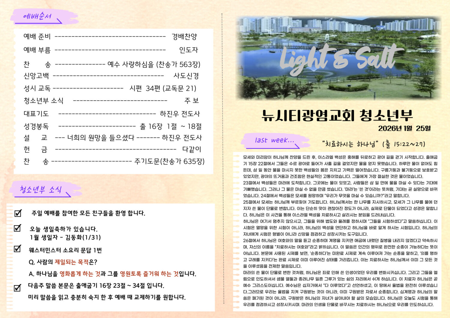 미리보는 1월 25일 청소년부 주보 By 하 진우 - 2026년 1월 25일 20 RELATED ARTICLESMORE FROM AUTHOR 미리보는 1월 18일 청소년부 주보 미리보는 1월 11일 청소년부 주보 미리보는 1월 4일 청소년부 주보 미리보는 12월 28일 청소년부 주보 미리보는 12월 21일 청소년부 주보