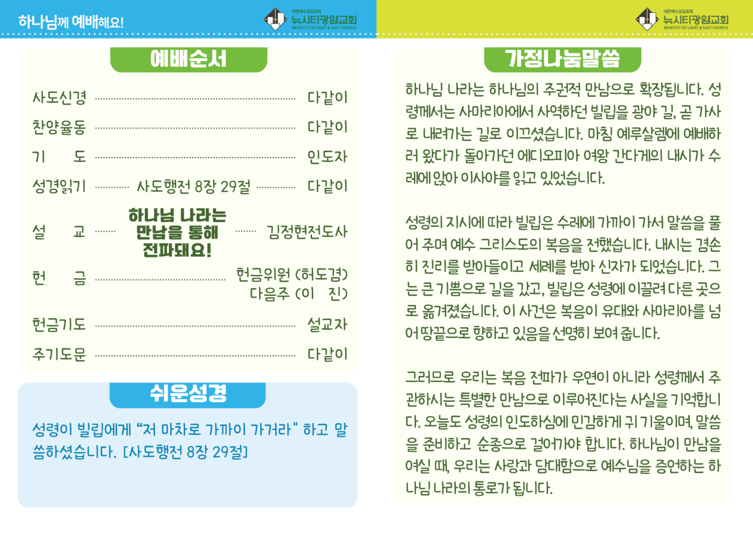 미리보는 2월 8일 영유치부 주보 By 김 정현 - 2026년 2월 7일 11 “하나님 나라는 만남을 통해 전파돼요!”사도행전 8장 29절 – 성령이 빌립에게 “저 마차로 가까이 가거라” 하고 말씀하셨습니다. RELATED ARTICLESMORE FROM AUTHOR 미리보는 2월 1일 영유치부 주보 미리보는 1월 25일 영유치부 주보 미리보는 1월 18일 영유치부 주보 미리보는 1월 11일 영유치부 주보 미리보는 1월 4일 영유치부 주보