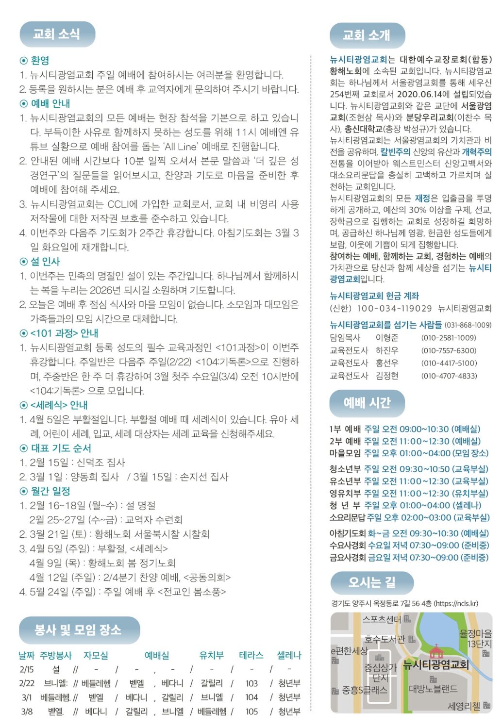 미리보는 2월 15일 주일 주보 By 이형준 - 2026년 2월 14일 22 RELATED ARTICLESMORE FROM AUTHOR 미리보는 2월 8일 주일 주보 미리보는 2월 1일 주일 주보 미리보는 1월 25일 주일 주보 미리보는 1월 18일 주일 주보 미리보는 1월 11일 주일 주보