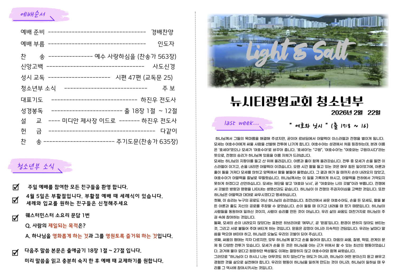 미리보는 2월 22일 청소년부 주보 By 하 진우 - 2026년 2월 22일 6 RELATED ARTICLESMORE FROM AUTHOR 미리보는 2월 15일 청소년부 주보 미리보는 2월 8일 청소년부 주보 미리보는 2월 1일 청소년부 주보 미리보는 1월 25일 청소년부 주보 미리보는 1월 18일 청소년부 주보