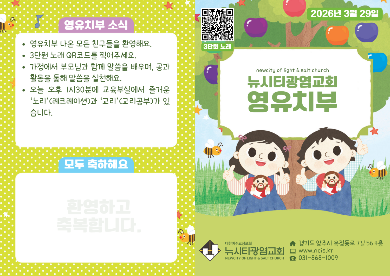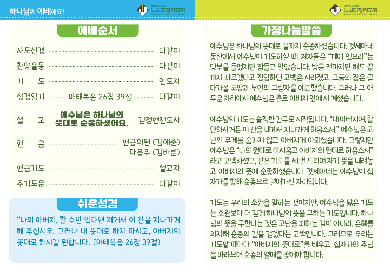 미리보는 3월 29일 영유치부 주보 By 김 정현 - 2026년 3월 28일 5 “예수님은 하나님의 뜻대로 순종하셨어요”마태복음 26장 39절 – 나의 아버지, 할 수만 있다면 제게서 이 잔을 지나가게 해 주십시오. 그러나 내 뜻대로 하지 마시고, 아버지의 뜻대로 하시길 원합니다. RELATED ARTICLESMORE FROM AUTHOR 미리보는 3월 22일 영유치부 주보 미리보는 3월 15일 영유치부 주보 미리보는 3월 8일 영유치부 주보 미리보는 3월 1일 영유치부 주보 미리보는 2월 22일 영유치부 주보